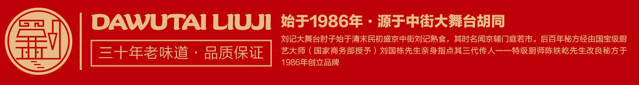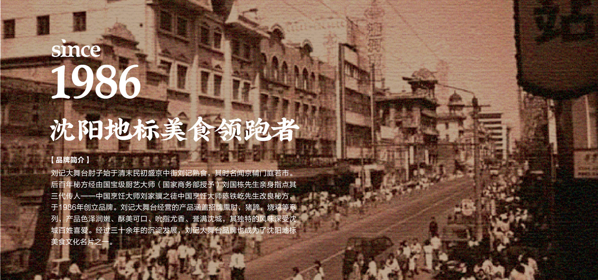 盛京,昔乃大清王朝發(fā)祥之地。劉記大舞臺肘子始于清末民初盛京中街劉記熟食,其時名聞京輔門庭若市。后百年秘方經(jīng)由國寶級廚藝大師(國家商務(wù)部授予)劉國棟先生親身指點其三代傳人——中國烹飪大師劉家驥之徒中國烹飪大師陳鐵屹先生改良秘方,于1986年創(chuàng)立品牌。劉記大舞臺經(jīng)營的產(chǎn)品涵蓋招牌熏肘,豬蹄,燒雞等系列,產(chǎn)品色澤潤嫩、酥美可口、吮指尤香、譽(yù)滿沈城,遂成古今絕味,其獨特的風(fēng)味深受沈城百姓喜愛。經(jīng)過三十余年的沉淀發(fā)展,劉記大舞臺品牌也成為了沈陽地標(biāo)美食文化名片之一。